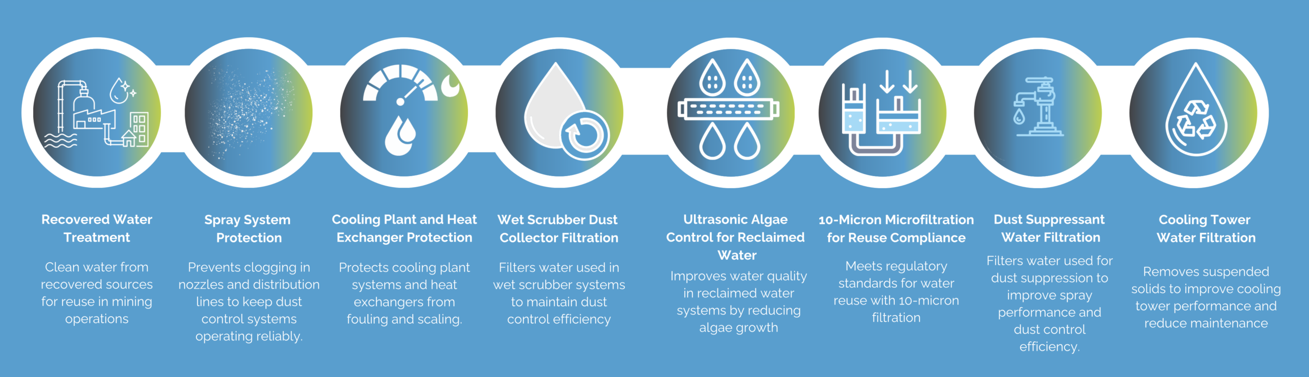 Abrasive Particles Process water in mining operations contains suspended solids, sand, and abrasive particles that damage pumps, clog spray nozzles, and interfere with flotation and separation processes. These contaminants cause premature equipment failure and costly unplanned maintenance.